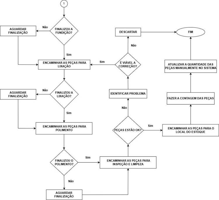 Na etapa seguinte, o coordenador encaminha o pedido à produção, que realiza os processos de fundição, lixação e polimento. Em seguida, as peças passam por inspeção e limpeza, sendo avaliadas quanto à conformidade com os padrões de qualidade. Produtos inadequados podem ser corrigidos ou descartados, com comunicação ao gerente de produção sobre a necessidade de refabricação.