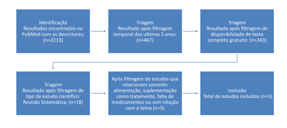 Em sequência, foi adicionada uma filtragem baseada no tipo de artigo, focando especificamente em revisões sistemáticas, que possuem maior relevância científica, e assim, restaram 18 estudos. Dessa forma, foram desconsiderados estudos relacionados somente à alimentação, suplementação de vitaminas, falta de relação medicamentosa ou sem relação com o tema, por meio da leitura dos resumos, restando 5 artigos.