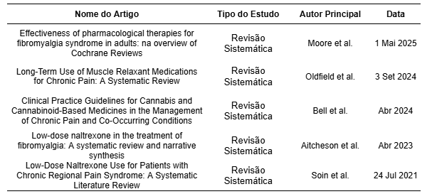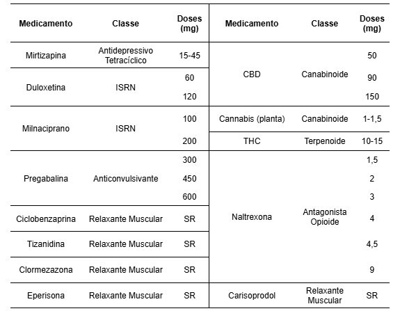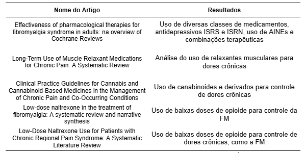 Em todos os estudos, foram encontrados resultados sobre o uso de medicações para o tratamento de dores crônicas e, principalmente, fibromialgia. Diversas classes de medicamentos foram analisadas (Tabela 2) para demonstrar quais efeitos benéficos esses medicamentos trazem aos pacientes de FM, além dos sintomas adicionais causados e efeitos colaterais.