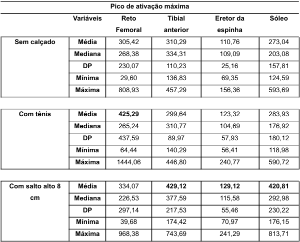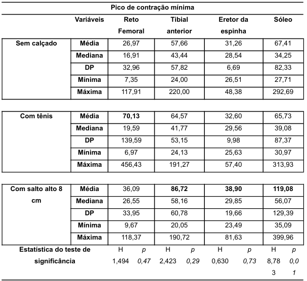 Foi realizado um teste de normalidade Shapiro-Wilk entre as variáveis de pico de ativação mínima (Reto Femoral (RF), Sóleo (SO), Tibial Anterior (TA) e Eretor da Espinha (EE)) os resultados apontaram para uma distribuição não paramétrica (p≤0,05). Desta forma, foi realizado o teste não paramétrico Kruskal-Wallis, onde apontou diferença significativa na ativação do músculo sóleo (p≥0,01). Desta forma, foi realizado o teste Post Hock de Bonferroni para verificar onde estava essa diferença, foi observado que houve uma diferença do grupo “Sem calçado” com o grupo “com salto alto 8 cm” (H= -10,650; p≥0,01) e entre o grupo “Com tênis e o grupo “Com salto 8 cm” (H= -9,450; p≥0,01).