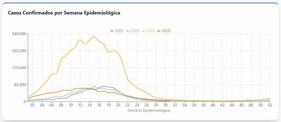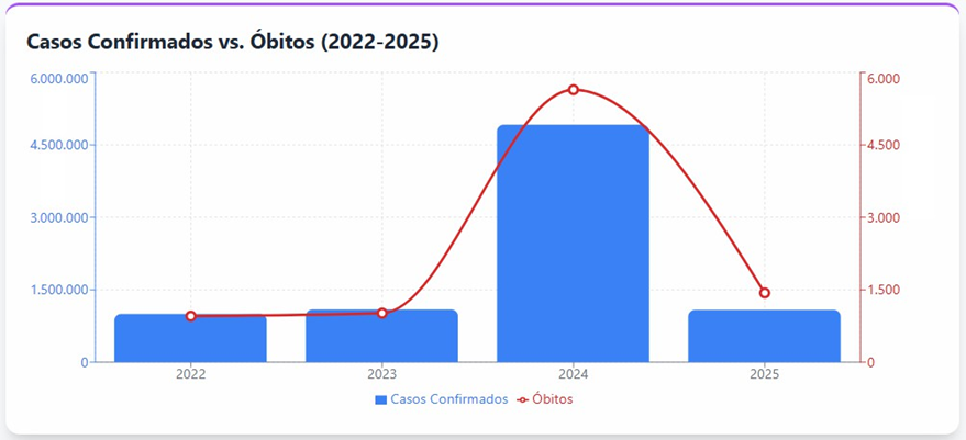 Figura 1: Casos confirmados vs. Óbitos (2022–2025)