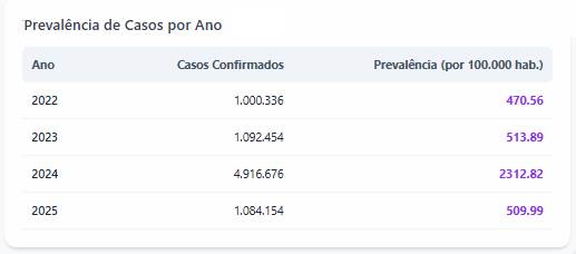 Observou-se um pico epidêmico em 2024. Enquanto 2022 e 2023 somaram 2.092.790 casos, 2024 sozinho contabilizou 4.916.676 – representando 60,7% do total do quadriênio e um crescimento de 235,0% em relação ao acumulado dos dois anos anteriores. A prevalência em 2024 foi 4,7 vezes superior à média de 2022-2023 (492,2 casos/100 mil). A diferença percentual entre a prevalência de 2024 e a soma das prevalências de 2022 e 2023 (984,3/100 mil) atingiu 134,9%, evidenciando a intensidade da crise naquele ano.