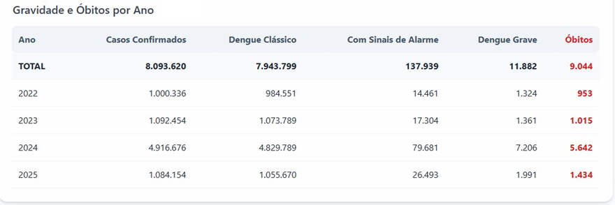 Os óbitos confirmados no período atingiram 9 mil, representando 6,0% dos casos graves ou com sinais de alarme. Os dados parciais de 2025, por sua vez, já superam os níveis epidemiológicos de 2022-2023, com aproximadamente 1.434 mortes, sendo esse valor 50% maior do que em 2022. Achados similares também foram retratados por Gurgel et al (2024) detectam, de fato, um aumento significativo de casos em 2024 em relação aos demais anos analisados, evidenciando uma equivalência com os achados registrados.