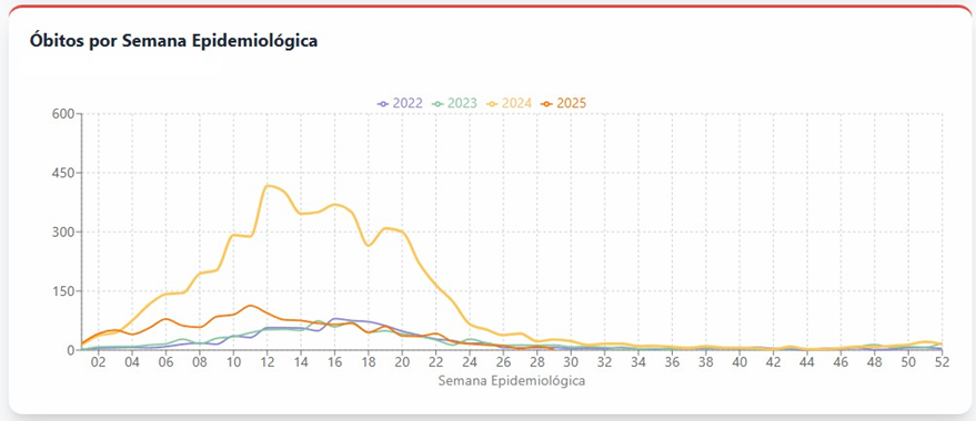Paralelamente, os óbitos acompanharam esse padrão: 65,4% das mortes de 2024 (3.688/5.642) ocorreram nas semanas 10-20, com pico na semana 16 (369 óbitos) – valor 4,6 vezes superior ao máximo de 2022 (80 óbitos, semana 16) e 6,3 vezes maior que 2023 (59 óbitos, mesma semana).