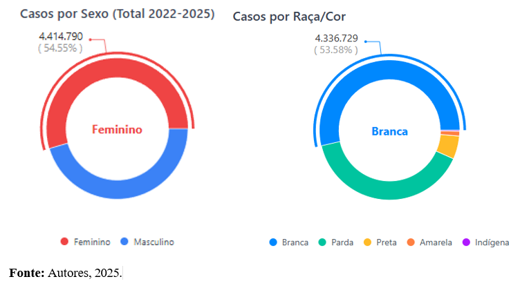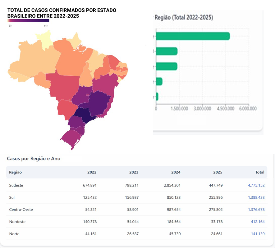 Diante da circulação concomitante de diversas arboviroses no território nacional, como dengue, chikungunya e Zika, os processos de vigilância, monitoramento e resposta tornam-se ainda mais essenciais. Assim, a análise do comportamento sociodemográfico da dengue no período de 2022 a 2025 é fundamental para orientar estratégias qualificadas de prevenção, controle e mitigação dos danos, possibilitando compreender tanto sua distribuição entre as diferentes regiões do Brasil quanto o perfil epidemiológico dos indivíduos mais acometidos pela doença.
