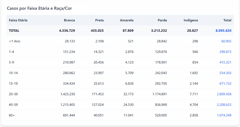 A análise da dengue em relação à composição demográfica do Brasil (IBGE, 2022) mostra que os brancos, que representam 43,5% da população, estão super-representados nos casos (53,6%). Em contraste, a população parda (46,8% da população) e preta (9,4%) estão sub- representadas nos registros da doença, com 39,7% e 5,4% dos casos, respectivamente. A população indígena, apresenta provável subnotificação.