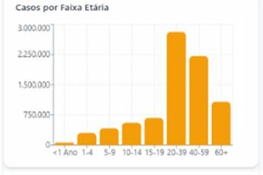 A distribuição dos casos de dengue por faixa etária entre 2022 e 2025 confirma o padrão de maior vulnerabilidade em adultos jovens. O grupo 20-39 anos foi o mais acometido, representando 34,7% do total (2.809.458 casos), seguido pela faixa 40-59 anos com 27,3% (2.208.632 casos). Juntos, esses grupos concentraram 62,0% das infecções reforçando que a dengue impacta principalmente a população economicamente ativa (Miranda et al., 2024).