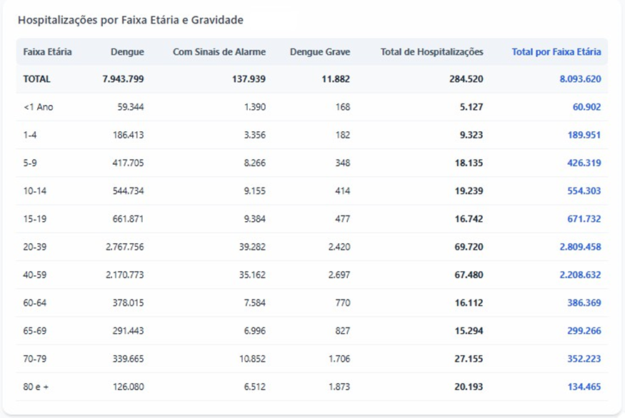 Em contraste, adultos jovens (20-59 anos), embora responsáveis por 62,0% do total de casos, tiveram baixos índices de complicações: apenas 0,1% evoluíram para dengue grave e 3,0% requereram hospitalização.