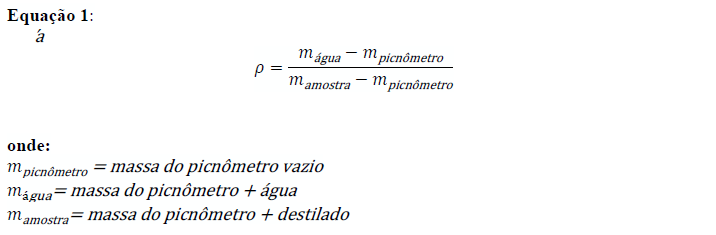 A determinação da densidade relativa do destilado foi realizada utilizando picnômetro de 10 mL, conforme metodologia descrita por Zenebon, Pascuet e Tiglea (2008). picnômetro foi higienizado, lavado com álcool, enxaguado com éter e seco à temperatura ambiente. Foram realizadas três pesagens sucessivas: picnômetro vazio, picnômetro com água destilada a 20 °C e picnômetro com o destilado obtido.