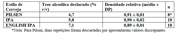 Os valores obtidos foram utilizados para comparar o comportamento físico-químico dos estilos analisados.