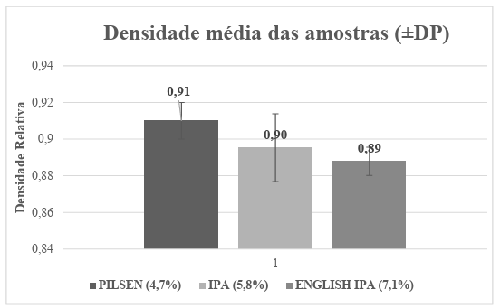 Os valores de densidade e índice de refração foram organizados e processados em planilhas no software Microsoft Excel®. Para cada estilo de cerveja e para cada método analítico (picnometria e refratometria), foram calculadas a média aritmética e o desvio padrão das dez repetições experimentais. Os gráficos utilizados na seção de Resultados foram gerados no próprio Excel®, utilizando barras com médias e barras de erro representando os desvios padrão. Os teores alcoólicos declarados nos rótulos das cervejas foram empregados apenas como referência comparativa para interpretação físico-química dos dados, sem aplicação de validação formal ou cálculo de erro percentual.