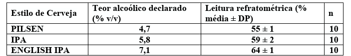 Dessa forma, a refratometria foi utilizada como ferramenta auxiliar para avaliar a tendência entre os estilos de cerveja, permitindo observar a relação esperada entre maior teor alcoólico declarado e maiores valores refratométricos do destilado, em concordância com estudos de refratometria aplicados a matrizes fermentadas complexas (LACHENMEIER et al., 2010; ROSENFELD; GÄNZLE, 2021).