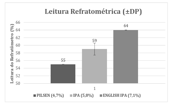 As leituras refratométricas apresentaram maior capacidade discriminatória entre os estilos avaliados (Tabela 2; Gráfico 2). A Pilsen apresentou leitura média de 55%, seguida pela IPA (59%) e pela English IPA (64%), mantendo coerência com os teores alcoólicos declarados pelos fabricantes.