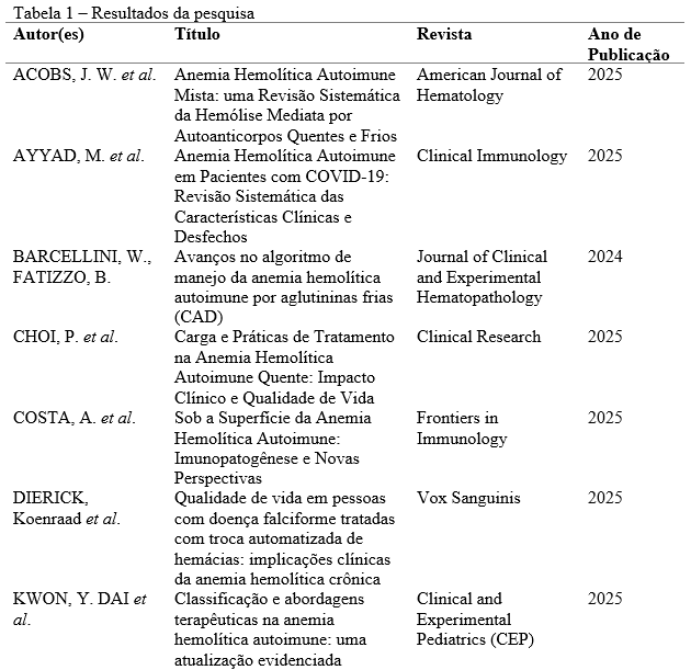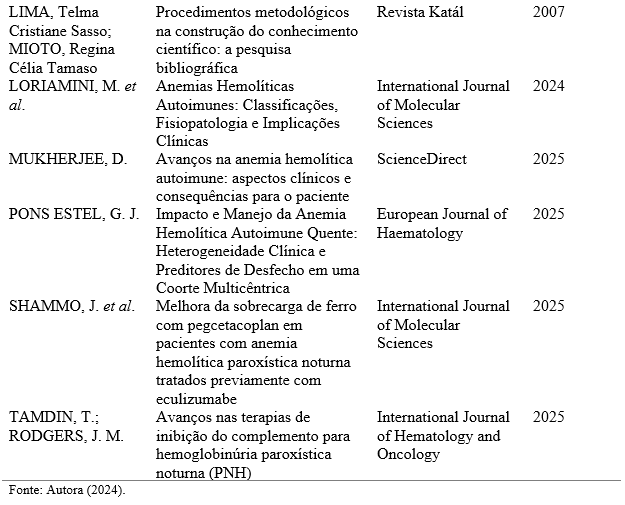 Foram estabelecidos dois critérios de inclusão para os estudos selecionados: artigos que abordassem especificamente o manejo terapêutico da anemia hemolítica e estudos publicados entre 2021 e 2025. Quanto aos critérios de exclusão, foram descartados artigos que não abordassem diretamente tratamentos ou intervenções clínicas para a anemia hemolítica e estudos fora do período de 2021 a 2025. Segundo Lima e Mioto (2007), a revisão de literatura é uma metodologia eficaz para reunir, analisar e interpretar as contribuições científicas já estabelecidas, proporcionando uma base sólida para a construção do conhecimento em um campo específico.