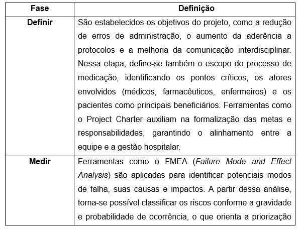 O modelo DMAIC (Definir, Medir, Analisar, Melhorar e Controlar) constitui a espinha dorsal do Six Sigma e orienta a análise sistemática dos processos envolvidos na prescrição, preparo, administração e monitoramento de medicamentos (Carretero; Grimshaw, 2024 & Peruchi, 2012). O quadro 1 explicita as definições das fases do modelo DMAIC.