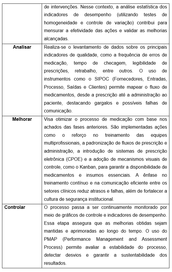 A análise da literatura permitiu constatar que a aplicação da metodologia Lean Six Sigma, sobretudo por meio do ciclo DMAIC, representa uma ferramenta altamente eficaz na prevenção e redução de erros de medicação em unidades de internação hospitalar. Ao integrar princípios de melhoria contínua, padronização de processos e gestão baseada em evidências, o Lean Six Sigma contribui diretamente para o fortalecimento da segurança do paciente, a otimização do fluxo de trabalho e a elevação da qualidade assistencial.