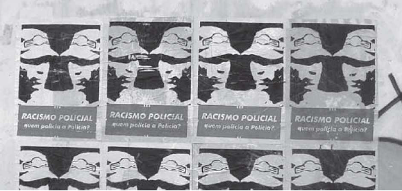 Figura 7 – Cartazes Racismo Policial: Quem Policia a Polícia? colados em torno do 1°  Batalhão da Polícia Militar de São Paulo, Jardim Luiz, zona sul da capital paulista. Fonte:  FRENTE 3 DE FEVEREIRO. Zumbi somos nós: cartografia do racismo para o jovem urbano. São Paulo: Programa de Valorização de Iniciativas Culturais, 2006, p. 32.