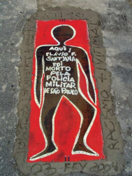 Assim, o que o Monumento Horizontal acrescenta no cenário citadino é como um grito denunciativo do que a cartografia elaborada pelo coletivo estabelece: a clara  verticalidade exposta no assassinato de Flávio Sant’Ana pela Polícia Militar. Este crime9ocorrido no dia 3 de fevereiro de 2004 demonstra-se como central no trabalho  do coletivo ainda naquele ano, tendo também sido tratado como um episódio de  racismo policial. Algumas outras intervenções foram também realizadas pela Frente  nesta direção, levantando a questão como um problema social de diversas amplitudes.