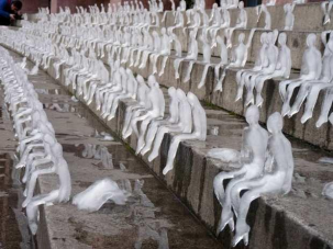 Tal aspecto horizontal também aparece na intervenção urbana Monumento  Mínimo, em que a artista Néle Azevedo posiciona pequenas estátuas de corpos  humanos feitas de gelo, medindo 20 centímetros de altura, sentadas em locais  públicos, postas a derreter. A escolha pela escala mínima denuncia uma transgressão  do imponente, do “gigantesco”, bem como evidencia a ligação com a população, com  o social, retratado em cada estatueta que compõe o grupo de esculturas da intervenção.  Essa ação, realizada em distintos locais e países, conecta-se também com diversos  fatores concernentes à subversão das características dos monumentos oficiais. Acerca da quebra que sua obra propõe, Azevedo esclarece-nos4