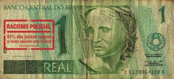 Figura 4 – Frente 3 de Fevereiro, Racismo Policial, 2004, intervenção realizada sobre cédulas  da moeda corrente no país, carimbo sobre papel-moeda. Fonte: <http://casadalapa.blogspot.com.br/2009/02/frente-3-de-fevereiro-zona-de-acao_19.html>. Acesso em: 15 dez. 2024.