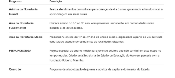 Vale destacar que, paralelamente, o Acre também se beneficia de políticas oriundas de programas nacionais, implementadas por meio de parcerias e verticalizações do Ministério da Educação. Essas ações complementam os esforços estaduais, especialmente no que diz respeito à ampliação de infraestrutura escolar, à capacitação de docentes e à elaboração de materiais didáticos adaptados às realidades locais.