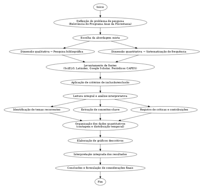 Na etapa qualitativa, adotou-se a pesquisa bibliográfica como estratégia principal, orientada à identificação, seleção e análise de produções acadêmicas (artigos científicos, dissertações e teses) (fluxograma 1) que abordam diretamente o Asas da Florestania ou que o utilizam como referência para discussões sobre Educação do Campo. A análise interpretativa buscou identificar recorrências temáticas, conceitos-chave, estratégias metodológicas empregadas e críticas apresentadas pelos pesquisadores, permitindo construir um panorama analítico da forma como o programa é compreendido e avaliado no meio acadêmico.