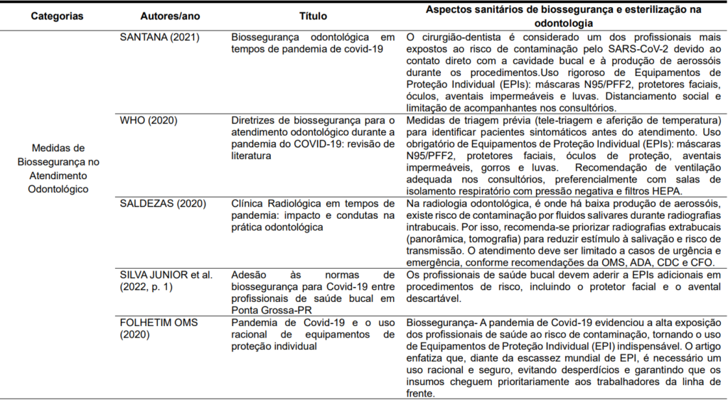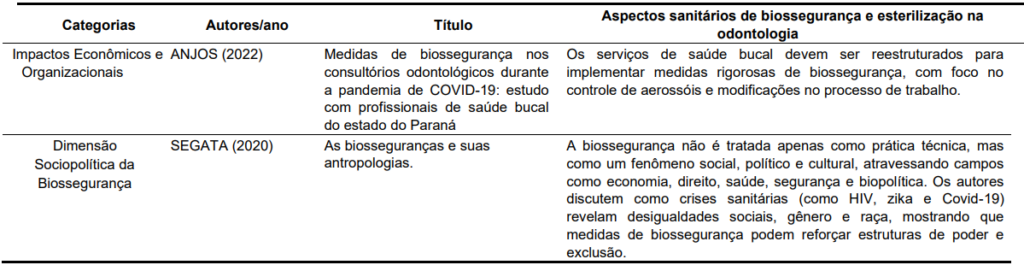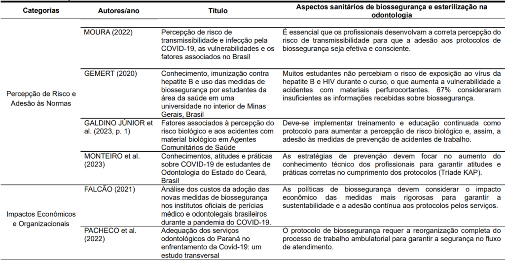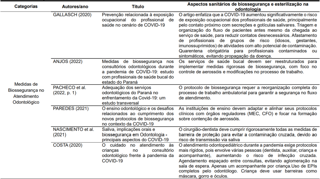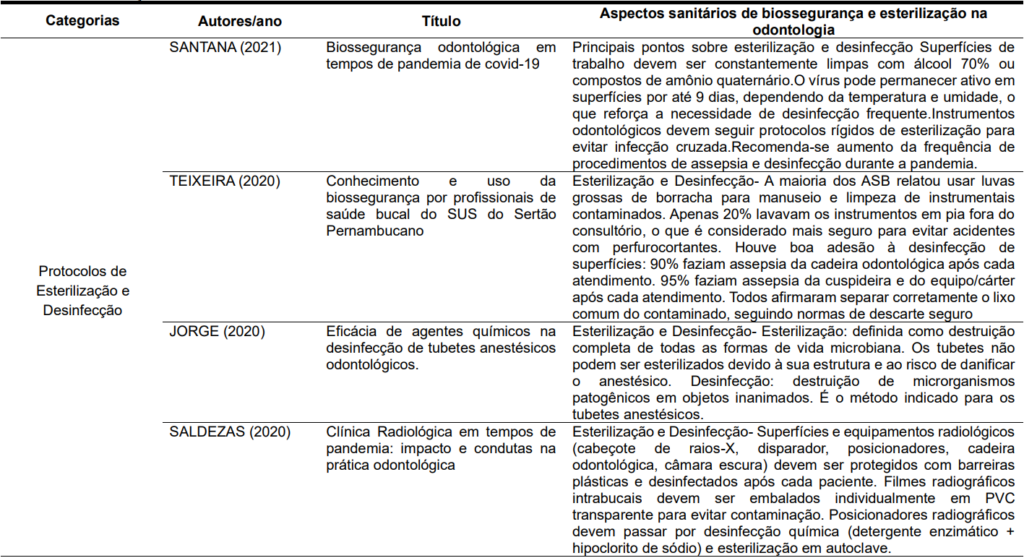 Após a leitura dos artigos na íntegra, foram categorizados os conteúdos dos artigos de acordo com as informações acerca dos aspectos sanitários de biossegurança e esterilização na odontologia da seguinte forma: