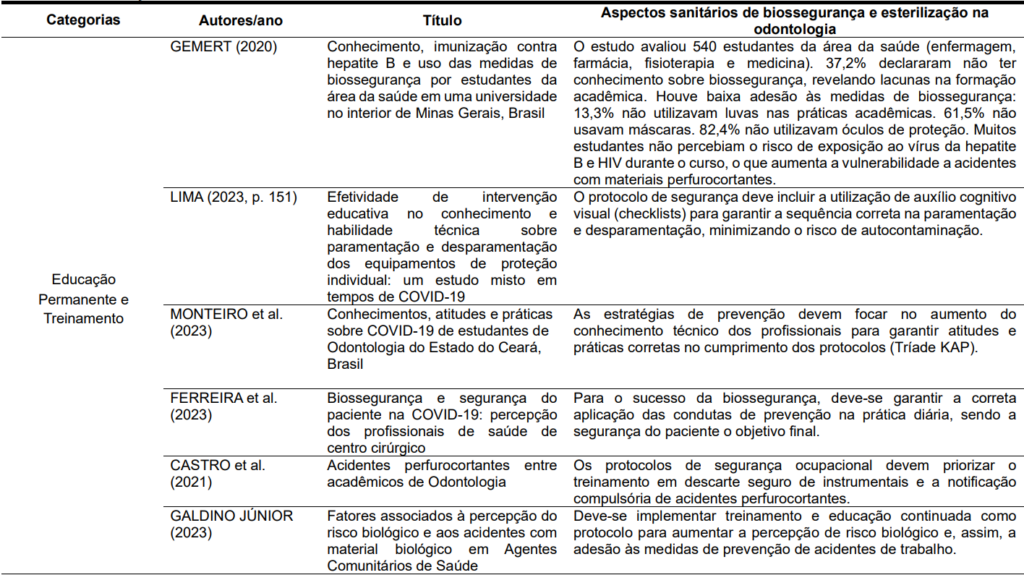 Na categoria Educação Permanente e Treinamento, os achados desta seção destacam aspectos relacionados à formação e atualização do profissional em biossegurança. Paredes et al. (2021), em estudo qualitativo, identificaram os principais desafios enfrentados no cumprimento dos novos protocolos de biossegurança diante do retorno das atividades presenciais nas instituições de ensino superior em Odontologia durante a pandemia da COVID-19.