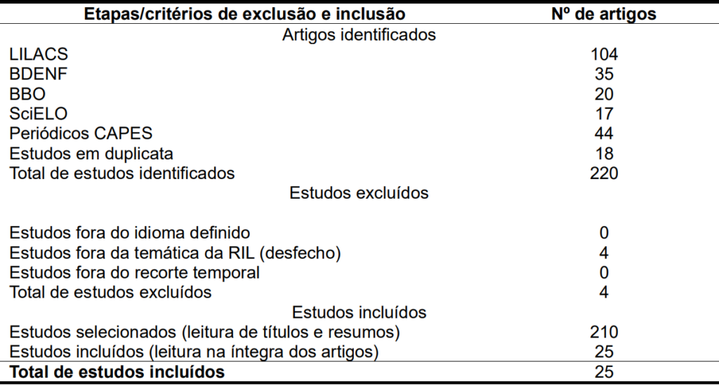 Foram excluídos os estudos que não foram publicados em periódicos indexados nos índices bibliográficos definidos; artigos publicados em outro idioma, sem ser o português; artigos incompletos que retratem a temática referente à RIL; artigos que não tratarem especificamente da temática referente à RIL; e estudos que estavam fora do recorte temporal.