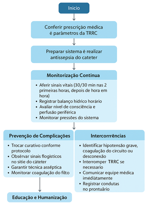 A segurança do paciente é o princípio norteador desse cuidado. Pesquisas recentes demonstram que a assistência de enfermagem, quando guiada por protocolos bem estruturados, ajuda a padronizar ações e a diminuir a ocorrência de eventos adversos (ALMEIDA et al., 2023; SÃO CAMILO, 2024). Além disso, práticas como higienização rigorosa, o cuidado na manutenção do acesso venoso e a monitorização hemodinâmica contínua são essenciais para evitar problemas relacionados a TSRC, como infecções, coagulação do sistema ou desequilíbrios hidroeletrolíticos (DIAS et al., 2025).