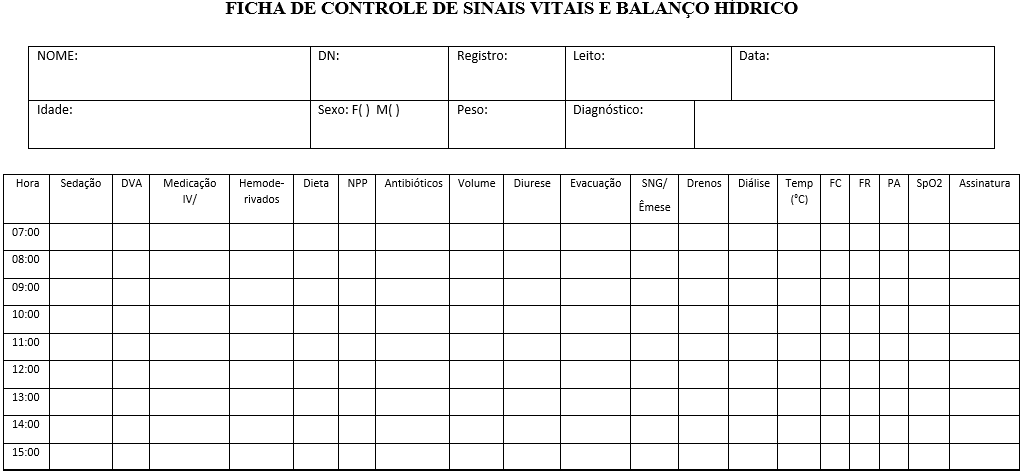INSTITUTO DE MEDICINA INTEGRAL PROFESSOR FERNANDO FIGUEIRA (IMIP). Ficha de Sinais Vitais e Balanço Hídrico. Código: IMIP.FOR.CONT.010. Versão 00. Recife: IMIP, [s.d.].