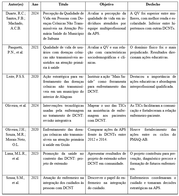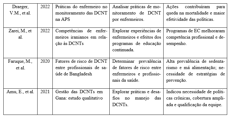 Para sistematizar as informações coletadas, foi elaborada uma tabela que compila os seguintes dados: os nomes dos autores, o título dos artigos, os objetivos e os desfechos dos estudos. Essa organização visa facilitar uma compreensão abrangente das práticas e dos desafios enfrentados por profissionais de enfermagem no cuidado a pacientes com doenças crônicas não transmissíveis (DCNT). Ao final, a metodologia adotada no presente estudo busca não apenas contribuir para o aprimoramento das práticas em saúde, mas também promover um cuidado mais efetivo e humanizado aos pacientes.