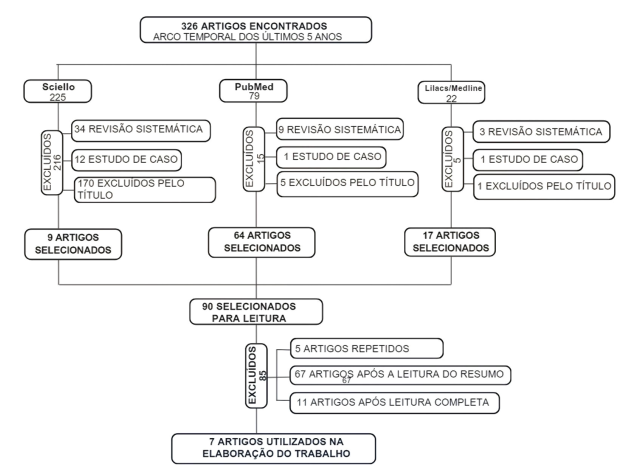 No total foram encontrados 326 artigos, sendo 225 do banco de dados SciELO, 79 da PubMed e 22 da base de dados LILACS/MEDLINE, que passaram pelos critérios de elegibilidade, totalizando 90 artigos para leitura de resumo. Dos 90 artigos previamente selecionados, 83 foram excluídos. Totalizando 7 artigos a serem utilizados para a elaboração do trabalho (Figura 1).