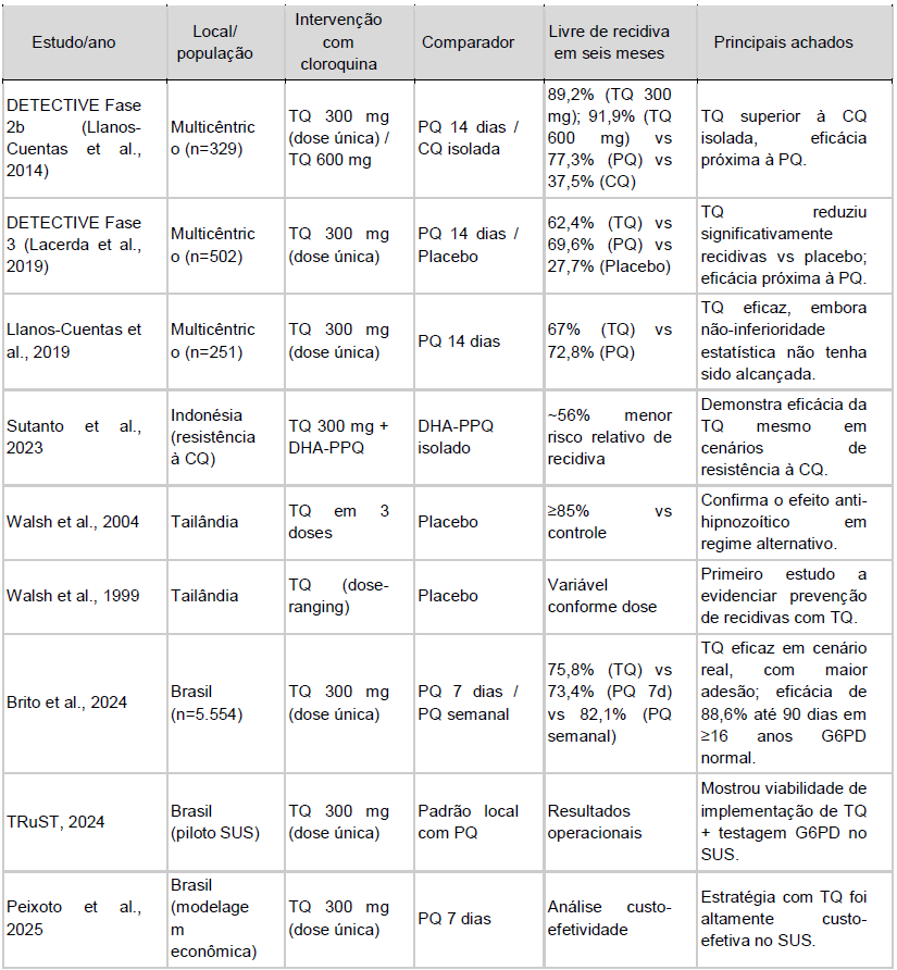 Ensaios anteriores já haviam indicado seu potencial anti-hipnozoítico. Walsh et al. (2004) demonstraram que regimes de três doses de tafenoquina preveniam recidivas de P. vivax, enquanto Walsh et al. (1999) já mostravam eficácia em estudos dose-ranging com prevenção significativa de recaídas.