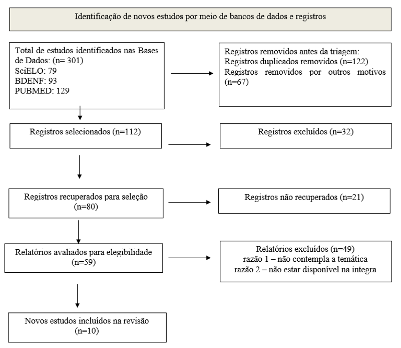 Foram selecionados 10 estudos para compor a seguinte revisão de literatura, nas seguintes bases de dados SCIELO, BDENF e PubMed, utilizando os descritores combinados: Hanseníase; Tratamento; Enfermagem; Adesão farmacêutica. Os critérios de seleção podem ser observados na Figura 1.