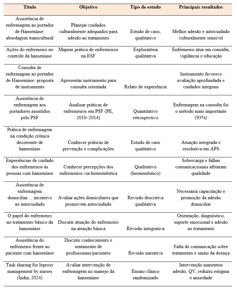 Portanto, este trabalho teve como objetivo analisar, através de uma revisão integrativa da literatura, o papel da enfermagem nos cuidados farmacêuticos voltados ao tratamento da hanseníase, com ênfase na adesão terapêutica e no manejo dos efeitos adversos.