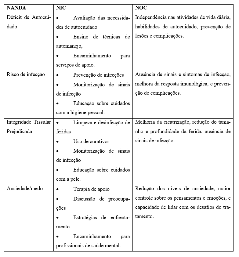 Quadro 2. Principais diagnósticos, intervenções e metas de enfermagem para pacientes com hanseníase em tratamento, segundo as taxonomias NANDA, NIC e NOC.