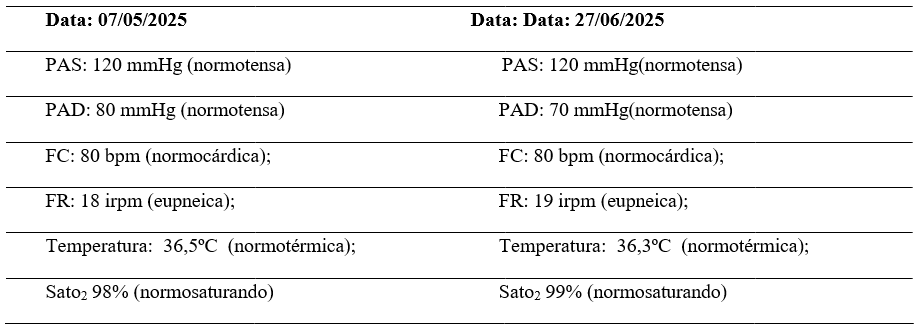 A Tabela 1 abaixo apresenta os parâmetros vitais da paciente em duas datas distintas, demonstrando estabilidade clínica ao longo do período observado. Os valores de pressão arterial, frequência cardíaca, frequência respiratória, temperatura corporal e saturação de oxigênio permaneceram dentro dos padrões de normalidade, indicando controle hemodinâmico e respiratório satisfatório.