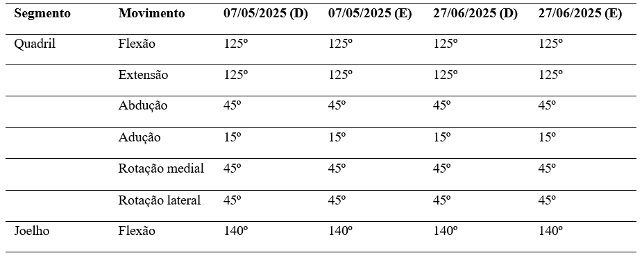 A tabela 2 descreve a amplitude de movimento articular dos principais segmentos corporais (quadril, joelho, tornozelo e ombro), nos lados direito e esquerdo, em dois momentos da evolução terapêutica, sendo observado a manutenção das amplitudes articulares em quase todos os segmentos, com melhora significativa na dorsiflexão do tornozelo direito, sugerindo avanços na mobilidade articular e resposta positiva ao tratamento fisioterapêutico.