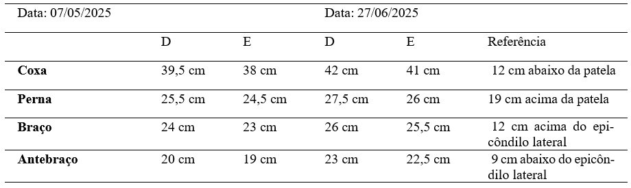 Na tabela 3, são apresentados os valores de circunferência muscular em diferentes segmentos corporais, comparando os dados de maio e junho de 2025. Os resultados revelam aumento das medidas perimétricas, evidenciando ganho de massa muscular e melhora no tônus, o que reflete positivamente no desempenho funcional da paciente.