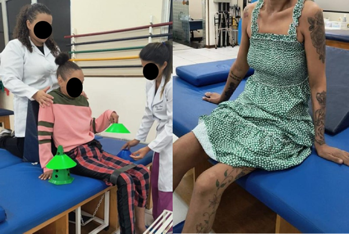 As imagens 1 e 2 abaixo demonstram, de forma visual e comparativa, a evolução clínica da paciente ao longo do processo de reabilitação. Na primeira imagem (momento inicial do tratamento), observa-se a necessidade de apoio com o uso de triângulos e auxílio manual de duas fisioterapeutas para a manutenção da postura sentada, evidenciando hipotonia muscular e déficit de controle postural. Já na imagem posterior, a paciente encontra-se sentada de forma independente, sem necessidade de suporte adicional, o que indica ganho de massa muscular, melhora do tônus e aumento da estabilidade do tronco.