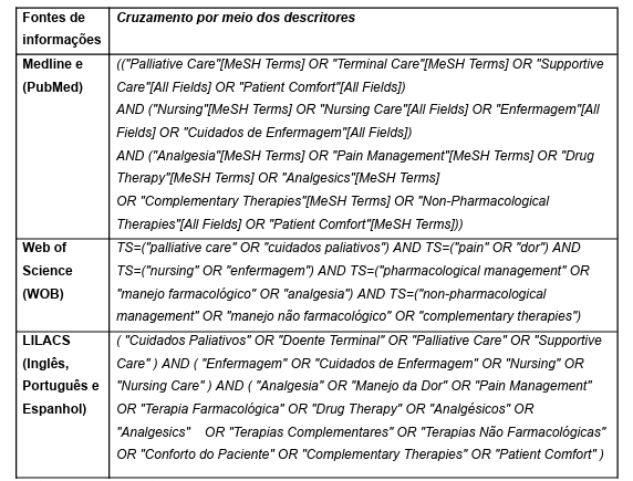 Os descritores principais incluíram termos relacionados a “cuidados paliativos”, “dor”, “enfermagem”, “manejo da dor”, “analgesia” e “terapias complementares”, contemplando tanto abordagens farmacológicas quanto não farmacológicas. A escolha desses descritores fundamenta-se na complexidade do manejo da dor em pacientes paliativos, que requer intervenções integradas, multidimensionais e multiprofissionais.
