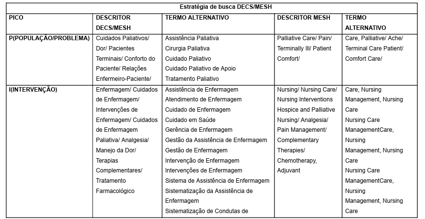 Definiu-se a questão de pesquisa por meio da estratégia PICO (Melnyk; Fineout-Overholt, 2019): (P) Pacientes em cuidados paliativos com dor. (I) Intervenções farmacológicas e não farmacológicas realizadas por enfermeiros. (C) comparação – “Não se aplica”. (O) Redução da dor, conforto e qualidade de vida. Assumindo esta premissa, elaborou-se a pergunta norteadora: “Quais as evidências disponíveis sobre a atuação do enfermeiro no manejo farmacológico e não farmacológico da dor em pacientes em cuidados paliativos e seus impactos na dor e na qualidade de vida?”