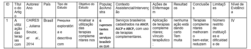 Os três estudos incluídos apresentaram delineamentos distintos, sendo um estudo exploratório-descritivo 33,3% (nível IV), um estudo qualitativo cartográfico 33,3% (nível VI) e um ensaio clínico randomizado e controlado 33,3% (nível II). Essa distribuição metodológicaPara aprofundar a análise dos estudos incluídos, elaborou-se o Quadro 3 com base no instrumento de coleta de dados proposto por Mendes, Silveira e Galvão (2008). Esse quadro apresenta uma síntese das principais variáveis extraídas dos artigos, como título, autores, país, tipo de estudo, objetivos, população, contexto assistencial, ações de enfermagem, resultados, conclusões, limitações e nível de evidência, permitindo uma visão comparativa e estruturada das evidências encontradas.