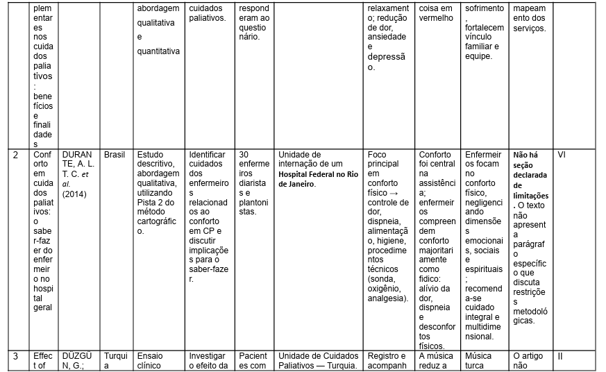 Quadro 3 – A síntese dos dados extraídos foi organizada segundo o instrumento proposto por Mendes, Silveira e Galvão (2008), contemplando variáveis como título, autores, país, tipo de estudo, objetivos, população, contexto assistencial, ações de enfermagem, resultados, conclusões, limitações e nível de evidência. Poços de Caldas-MG, 2025. possibilitou observar intervenções de enfermagem no manejo farmacológico e não farmacológico da dor em cuidados paliativos sob diferentes perspectivas aplicadas à prática clínica e ao cuidado centrado no conforto.