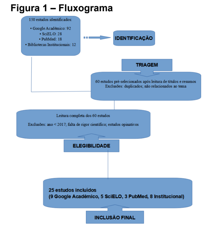 A busca inicial resultou em 150 materiais encontrados, incluindo artigos científicos, revisões, livros e documentos institucionais. Após a triagem dos títulos e resumos, 60 estudos foram pré selecionados.
