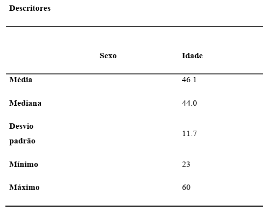 Legenda: Média de idade dos participantes=46,1; Mediana da idade dos pacientes=44,0; Desvio-padrão=11,7; Mínimo= Idade mínima 23; Máximo= Idade máxima 60