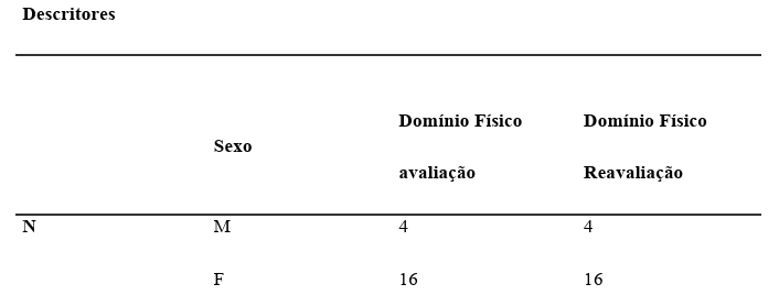 Em relação ao Domínio Físico, os valores médios (± desvio padrão) foram de 80,0 ± 14,7 para homens e 47,8 ± 22,1 para mulheres na primeira medida, e 94,5 ± 6,66 para homens e 78,8 ± 17,3 para mulheres na segunda medida. Os valores mínimo e máximo observados variaram de 65 a 95 para homens e de 20 a 95 para mulheres na primeira medida, e de 85 a 100 para homens e de 42 a 100 para mulheres na segunda medida.