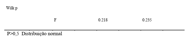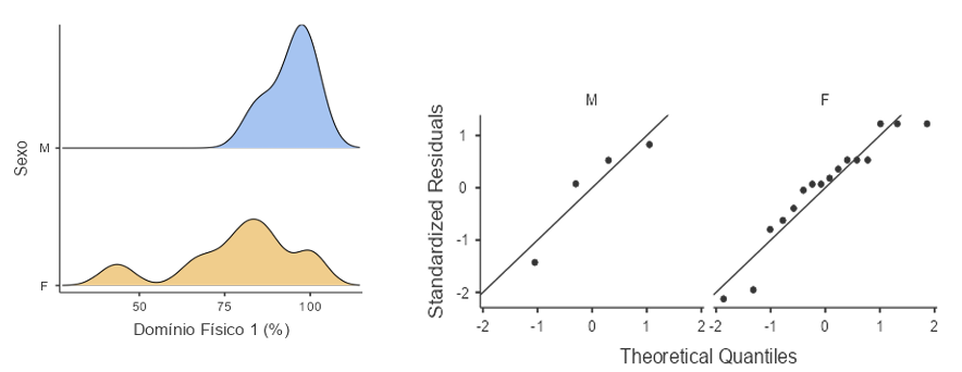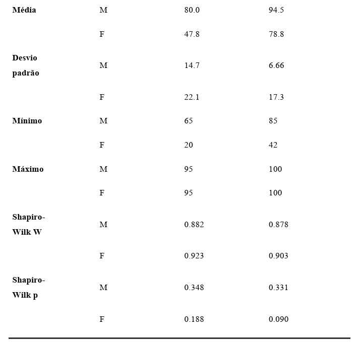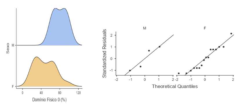 O teste de normalidade de Shapiro-Wilk indicou que os dados não diferiram significativamente da normalidade, tanto para homens (W = 0,882; p = 0,348 e W = 0,878; p = 0,331) quanto para mulheres (W = 0,923; p = 0,188 e W = 0,903; p = 0,090), sugerindo distribuição aproximadamente normal dos escores de Domínio Físico, onde foram encontrados P>0,5.