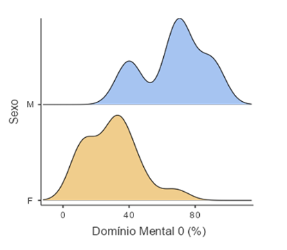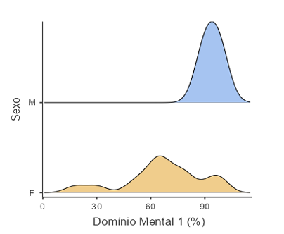 A análise da avaliação do Domínio Mental, expresso em (%) na Tabela 6 e Gráfico 7, demonstram diferenças marcantes na distribuição dos escores entre os sexos. Entre os participantes do sexo masculino, observou-se uma distribuição bimodal, com picos de concentração em valores intermediários e elevados, variando aproximadamente entre 40% e 90%, o que indica bom desempenho no domínio mental inicial. No grupo feminino, os escores mostraram-se mais dispersos, com maior concentração entre 20% e 60%, sugerindo maior variabilidade individual e desempenho médio inferior quando comparado ao masculino.
